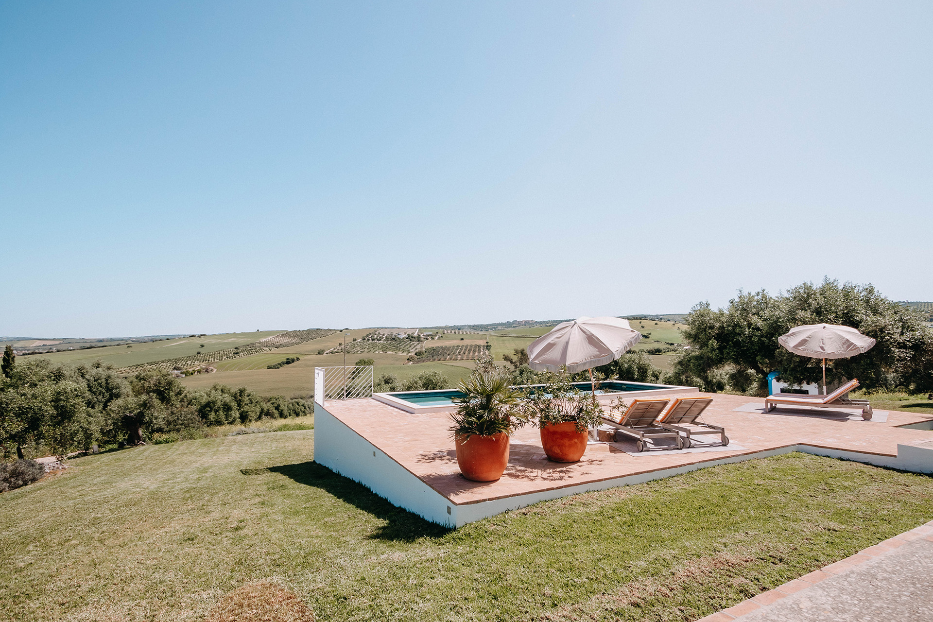 La piscine et sa terrasse se trouvent dans le jardin face à l’oliveraie.